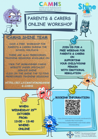 CAMHS Shine Team would like to share a free workshop for parents and carers during the school holiday on Wednesday 29th October from 13:00 - 13:40 online.