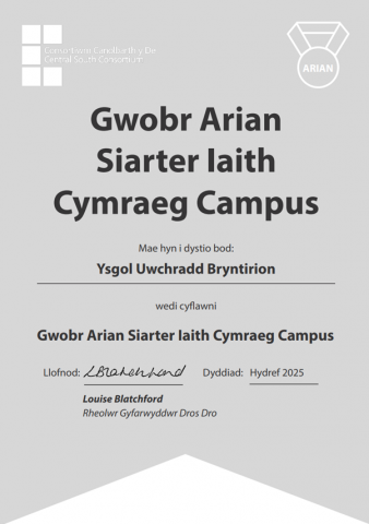 We are very proud to say that as of October 2025, we have received the award for the Siarter Iaith Gwobr Arian (Welsh Language Charter Silver Award). This displays our commitment as a school and community to promote our Diwylliant (Culture) and Hunaniaeth (Identity) as Cymry (Welsh people). Our Criw Cymraeg and Bilingualism team have worked hard to get this award and continue to promote Cymraeg at Bryntirion, to achieve the Gwobr Aur/Gold Award in due course.